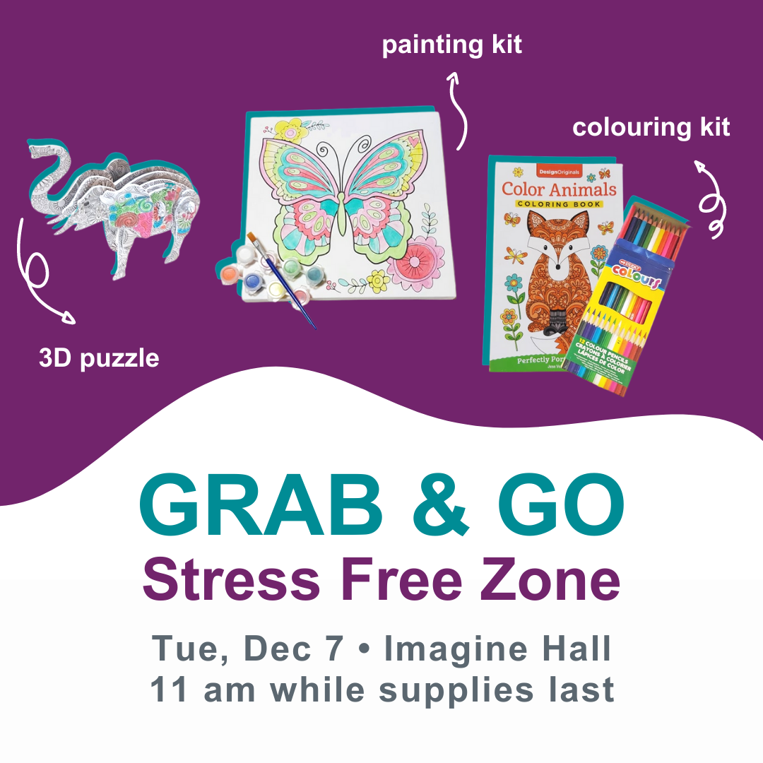 Starting at 11 am on Wed, Nov 24, visit us in Imagine Hall and grab one of three kits*. Choose from a painting set, a 3D jigsaw puzzle, or a coloring kit at our Grab & Go Stress Free Zone! Take one with you to de-stress wherever you’d like.