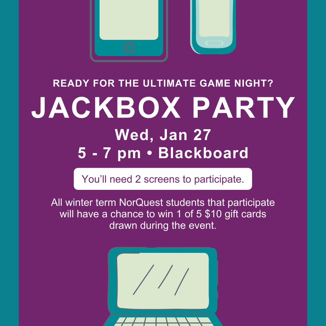 Join us for a fun and exciting time playing Jackbox Party. We’ll be playing quick rounds of Quiplash XL, Fibbage 2, Bidiots and Earwax.
