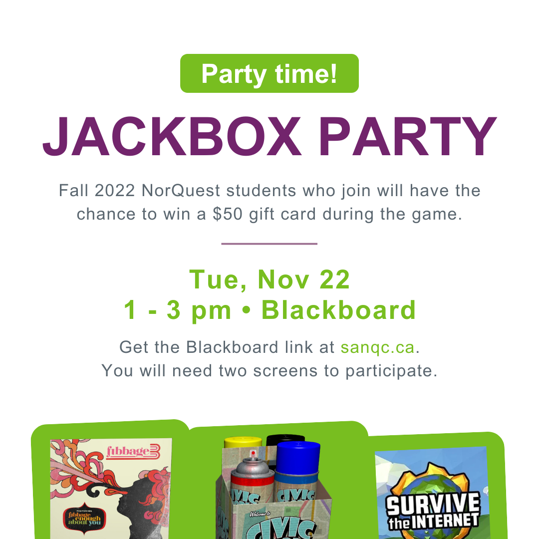 Join us on Blackboard for Jackbox Party Pack 4! Bring your NorQuest friends and find out who will leave with bragging rights!