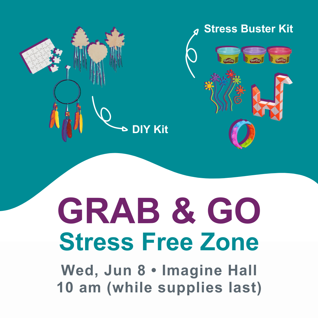Visit us in Imagine Hall and grab one of our two stress relief kits (while supplies last). Choose from either a DIY kit or a Stress Buster kit at our Grab & Go Stress Free Zone! Take one with you to de-stress and enjoy wherever you’d like.
