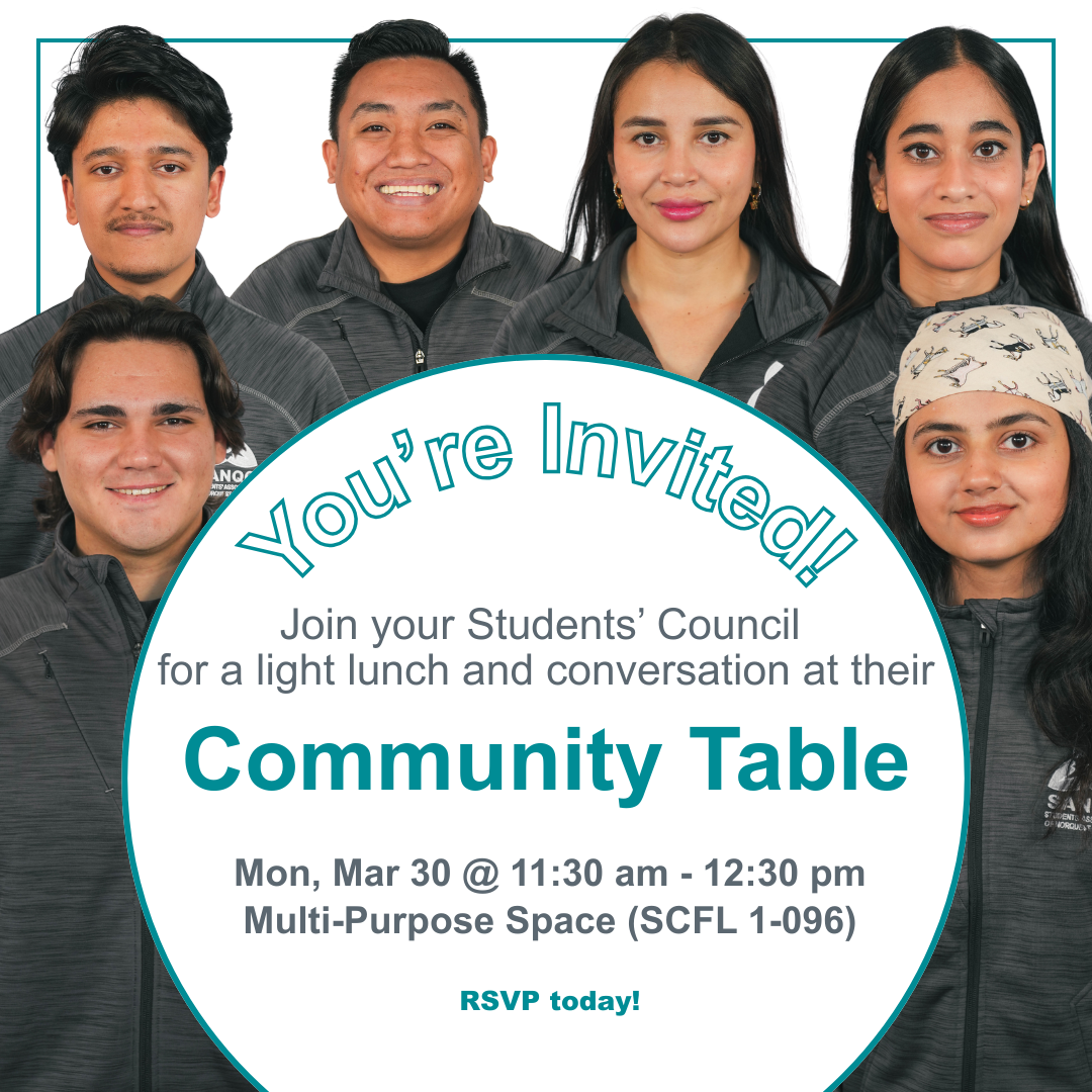 Join your Students’ Council Representatives for a complimentary light lunch, refreshments, and the opportunity to gather in conversation at their Community Table* on Mon, Mar 30 from 11:30 am – 12:30 pm in 1-096, SCFL.