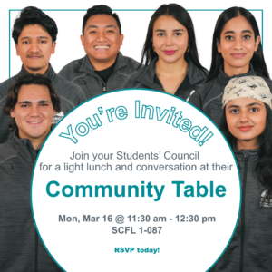Join your Students' Council Representatives for a complimentary light lunch, refreshments, and the opportunity to gather in conversation at their Community Table* on Mon, Mar 16 from 11:30 am - 12:30 pm in 1-087, SCFL. This is a registered event, at no cost to you, so be sure to RSVP HERE and secure a seat before Wed, Mar 11! *The Community Table is made possible by funding from Field Law