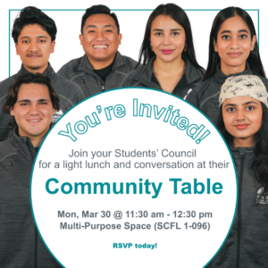 Join your Students' Council Representatives for a complimentary light lunch, refreshments, and the opportunity to gather in conversation at their Community Table* on Mon, Mar 16 from 11:30 am - 12:30 pm in 1-087, SCFL. This is a registered event, at no cost to you, so be sure to RSVP HERE and secure a seat before Wed, Mar 11! *The Community Table is made possible by funding from Field Law