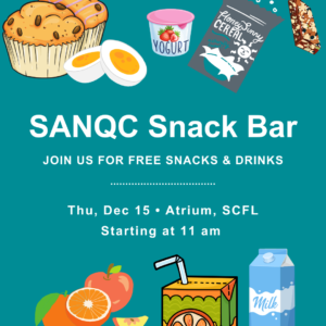 Find us across from the stairs by the Atrium starting at 11 am on Thu, Dec 15 for a SANQC Snack Bar! Grumbly tummy after your final? Come by and grab a sandwich. Need a drink before a test? Swing by to quench your thirst. Being a student can be challenging, we want to make sure food isn't one for you. First come, first served, while supplies last!