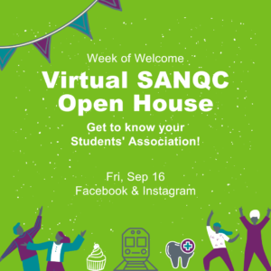 Your Students’ Council is kicking off Week of Welcome and they want to connect with YOU! Join them for some yummy cupcakes and refreshing drinks, play a game of prize pong, get a FREE student agenda, spin our giving wheel to get some fun SANQC swag, and have loads of FUN! Drop by and meet your Students' Council, get to know about who your Students' Association is, what we do and how we are here for you. Be one of…