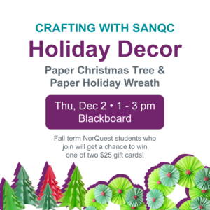 It's time to get decorating for the holidays! Make your space feel festive with these crafts you can create with these household items. Have these materials ready to craft along with us! Paper Christmas Tree Craft paper (preferably green) Scissors Paper Holiday Wreath Craft paper (preferably 10 green & 1 red) or newspaper Cardboard Twine and/or yarn Pen Scissors Tape Glue Two lucky fall term NorQuest students who participate will win a $25 gift card during the event. Join the…