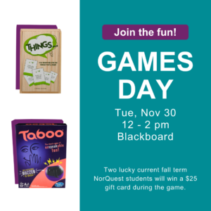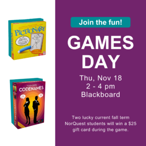 Meet new friends or bring your NorQuest friends with you for a fun afternoon of Games Day! We'll be playing Pictionary and Codenames and there's no prior game experience required. Here's a sneak peek of what to look forward to: Pictionary: Each player will have a chance to draw their chosen word and other players have to guess it to earn points. The person with the most points after the game, wins! Codenames: You’ll play as a spymaster or an…