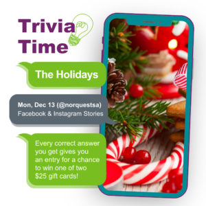 Did you know that there's a popular holiday milk punch in Canada called eggnog? Or that people traditionally tops their Christmas trees with an angel? Challenge yourself and your NorQuest friends to see who can get the most correct answers in our holiday! Check out our Facebook & Instagram stories (@norquestsa) on Mon, Dec 13 to play along. Every question you answer correctly will get you an extra entry for a chance to win one of two $25 gift cards!