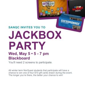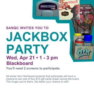 It's Jackbox Party time! Join us for “Murder Party”, “Quiplash 2”, and “Guesspionage”. Bring your NorQuest friends to play some Jackbox party pack 3! Murder Party: Correctly answer trivia questions to stay alive while you try to stay ahead of the game! If (likely when!) you become a ghost, the game isn’t over, so long as somebody is still alive, there’s a chance for you to return to the living… Quiplash 2: Give your funniest answers to a series of…