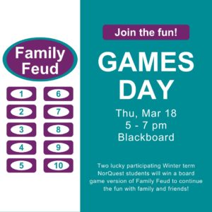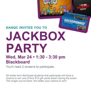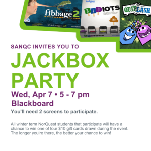 Jackbox Party is back, this time with Party Pack 3! Join us for fun rounds of Murder Party, Quiplash 2, Fakin’ It and Guesspionage. Whether it's for a few rounds or the entire event, bring your NorQuest friends to join forces or to claim bragging rights over them! Murder Party: Correctly answer trivia questions to stay alive and don’t get killed while you try to stay ahead of the game! If (likely when!) you become a ghost, the game isn't…