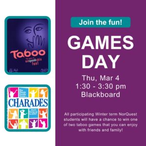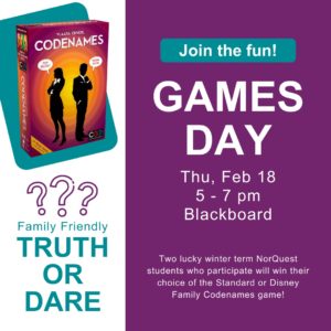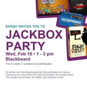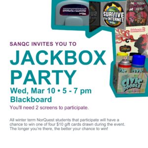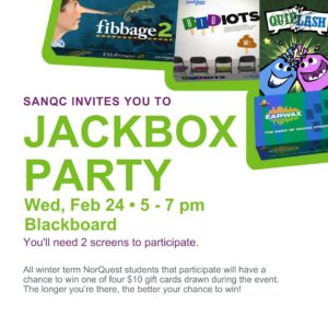 We are back for more Jackbox Party excitement with you! This time we will be playing Jackbox Party Pack 4. Drop by for a bit or stay for the entire event and don’t forget to bring some of your NorQuest friends for even more fun! Fibbage 3: Fib-til-you-win. Here’s your chance to fool your friends with clever lies. The more creative you are, the easier it’ll be to trick your opponents into believing your answer. Survive the Internet: Answer an…