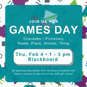 Take a break and join us for a fun afternoon playing games on Thu, Feb 4 from 1 - 3 pm. We'll be playing "Pictionary", "Charades" and "Name, Place, Animal, Thing". Don't forget to have your webcam ready, especially for when we play charades! All participating winter term NorQuest students will have a chance to win one of two $25 gift cards! Join in the fun on Blackboard here.