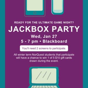 Join us for a fun and exciting time playing Jackbox Party. We'll be playing quick rounds of Quiplash XL, Fibbage 2, Bidiots and Earwax. If you can't stay for the full event, stop by to say hi and enjoy a few rounds of games while you're able. Make sure to let your NorQuest friends know, whether it's to play with them, or against them! You'll need 2 screens to participate. That could be a combination of a computer and phone,…